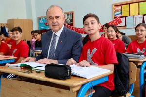 Okulda sınıf başkanı seçilen Yaman Kutlu Gümüş’ün davetine icabet eden Vali Erol, 680 öğrencinin eğitim ve öğretimini sürdürdüğü Karşıyaka Ortaokulunu ziyaret ederek, 7/C sınıfı öğrencisi Yaman’ı tebrik etti, sınıf başkanlığı görevinde başarı dileğinde bulundu.